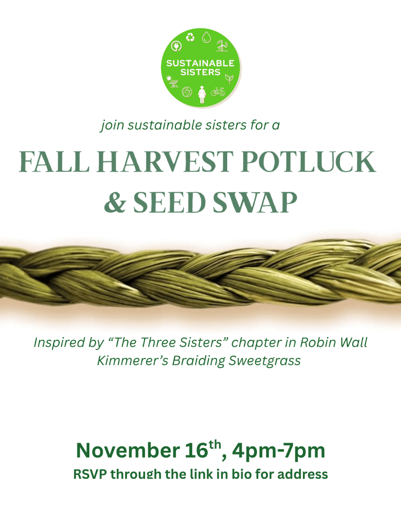 Inspired by Braiding Sweetgrass, this gathering brings us together in the spirit of gratitude and reciprocity. We’ll share a vegetarian/vegan potluck meal, co-cook with seasonal harvests, and add contributions to a communal soup. Please bring a dish to share (labeled) and seeds or plant cuttings for the swap if you have them.